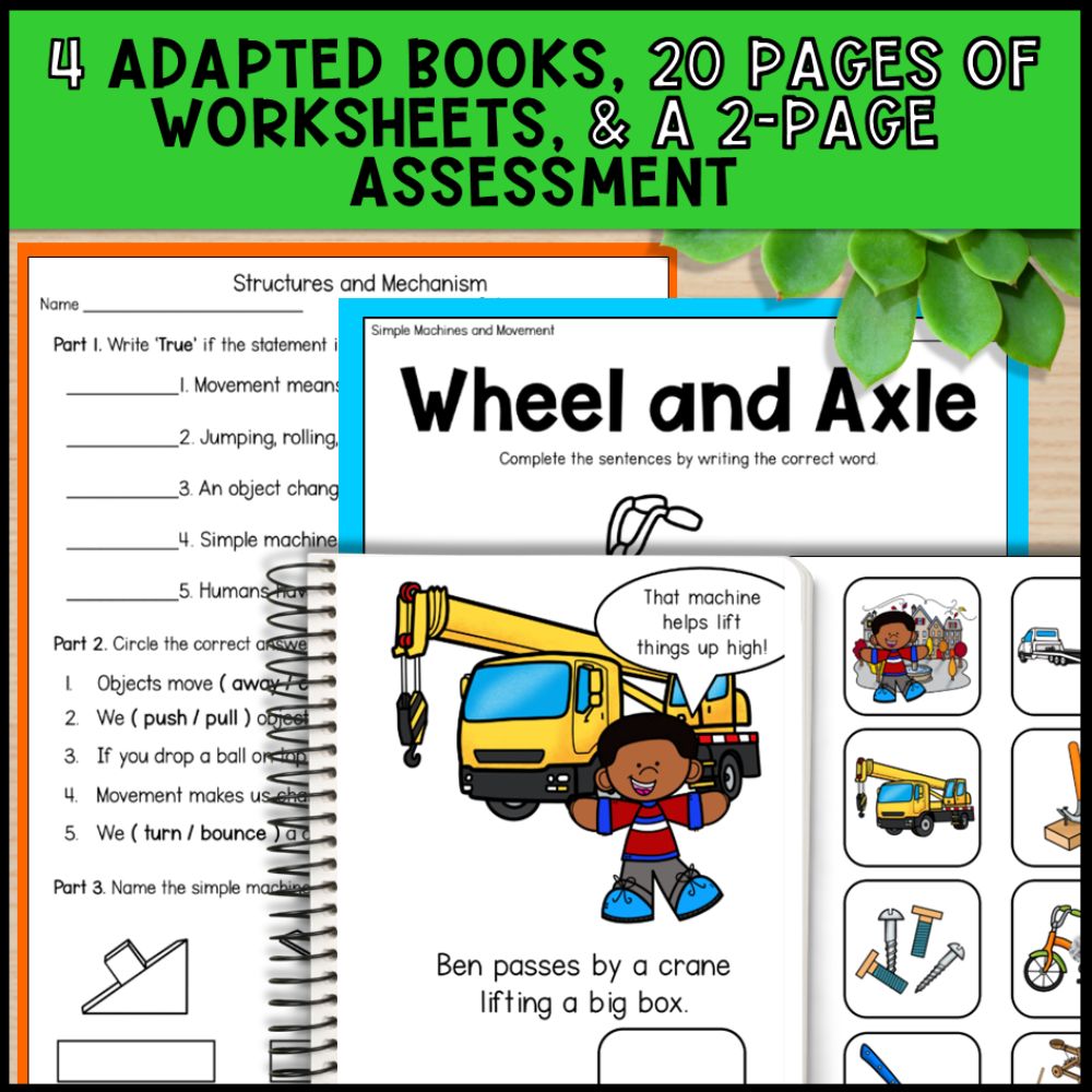 Help your students explore how things move and how machines make work easier. This unit supports special education, autism programs, and early primary classrooms by using visuals, repetition, and clear tasks to teach the basics of simple machines and movement.