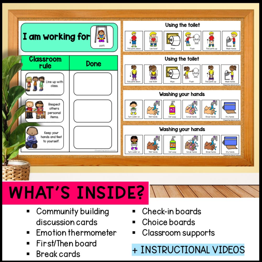 Our Visuals and Behavior Supports resource is a toolkit designed to enhance classroom management and promote self-regulation, particularly tailored for students with autism and special needs. This resource is packed with an array of visual aids and tools, making it an essential asset for any special education classroom.